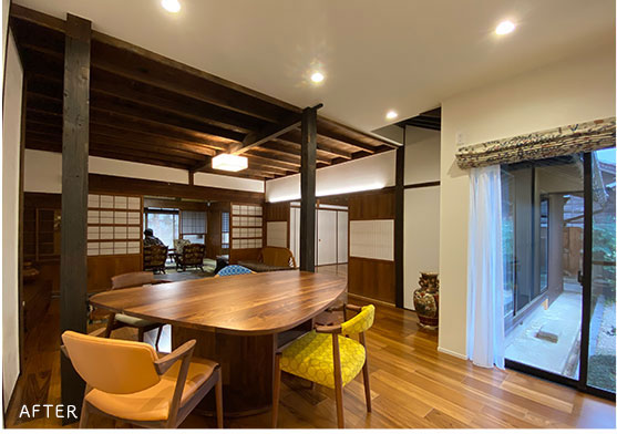 | 家主が所有の山から伐り出した木によって、伝統工法で建てられた住宅をリノベーションしました。 竣工は昭和21年、第二次世界大戦後1年目です。日本ではそのあとGHQの指導により現行の「建築基準法」が制定され、日本の伝統工法はどんどん少なくなっていきました。この住宅は焦土と化した街の中、復興第一号群の一軒として建てられました。 |