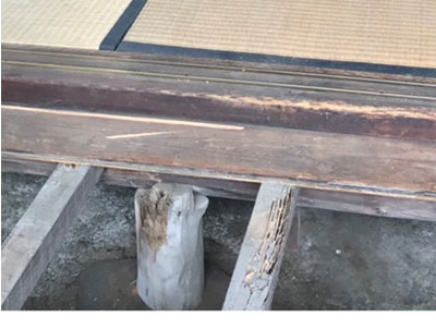 畳の下の根太がシロアリ被害。束(縦の短い丸太)も土にそのまま乗っかっています。これでは、湿気を含んだ土の水分が伝わることでも木が傷んでしまいます。