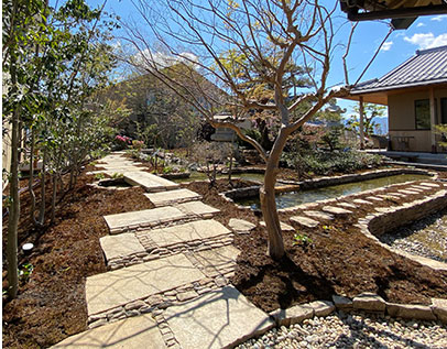 | ガーデンデザインは、末武伸彦氏率いるグリーンラボ作。旧庭で解体した石を組みなおし、積み上げ、滝を作りました。「夢創の滝」と名付けられたつづら折りの小川には、浅野社長が放った金魚が泳いでいます。小さなお客様がそれを追いかけて何時間もこの庭を走っている姿が、社長が望んだ一番美しい景色です。 |