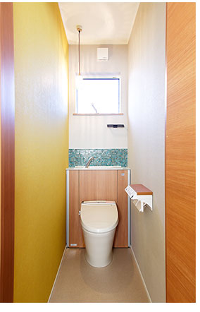 | お二階のトイレは、窓寄りですが、北窓なのとすりガラス窓のため、こんなプリズムは見られません。その代わり、手洗いの壁にランプと同じようなガラスのタイルを貼りました。クロスは、アンバーとグレーのコントラストで、4色使いながらも、シックに。 | 階段周りの収納2箇所。 階段を下りてくると洗濯機があります。洗濯機は洗面所に置く、といわない頭の柔らかさで、洗面所に収納スペースができます。 | 階段下のくぼみも逃さず浅い棚をつけることで、 省スペース兼、見やすい片付けができるようになりました。 |