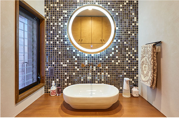 ミラーと天板は平塚家具ライムズでオーダーし、タイルは名古屋モザイクの「ギャラクシー」を張っています。 このタイル、ガラスと陶磁器が美しくミックスされていて、間近で見るほど輝いています。 |