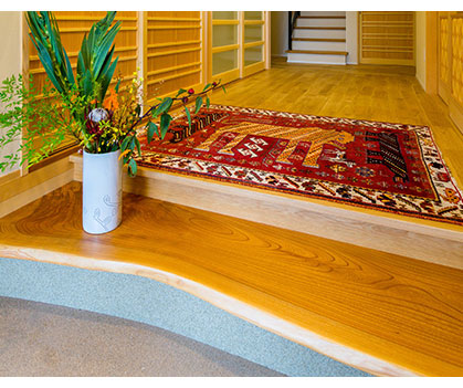 | 玄関の幅は一間(いっけん=1800mm)です。そこにつづきの土間と小縁(こえん=縁側の奥行きの浅いもの)を作りました。というのももともとの日本庭園が見事でしたので、それを鑑賞するためです。訪れた人は玄関でなく、小縁のほうへ移動してちょっと腰かけて話し、正面の庭を楽しむことができます。 小縁はもともと雪国に多いスタイルで、雪に降りこめられても着物をぬらさず茶会が開けるようにと始まりました。そんな地味な理由ながら、結果的に雪国の暗さを室内オープンテラスで解消するという、ステキな解放感がある空間となっています。 |